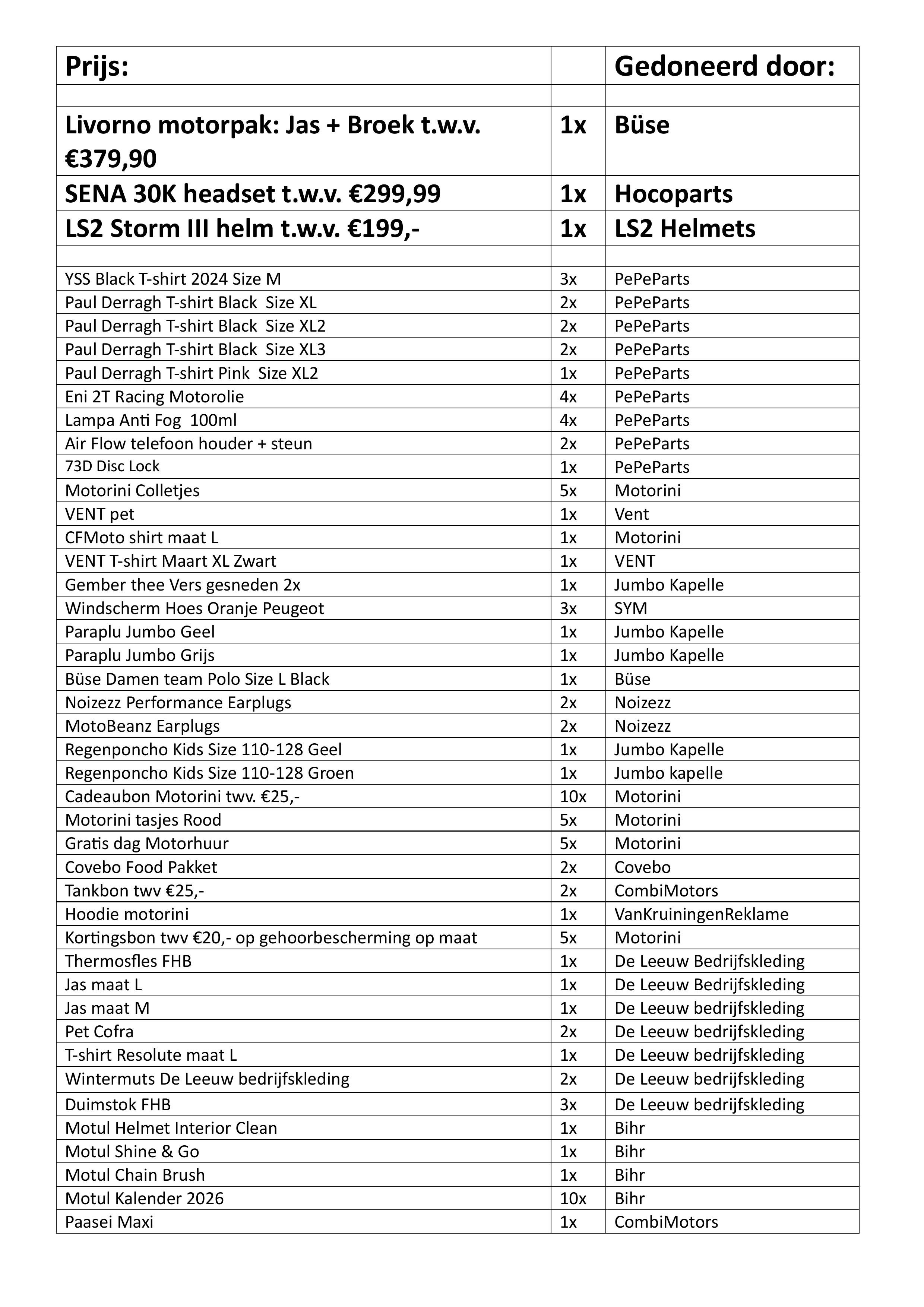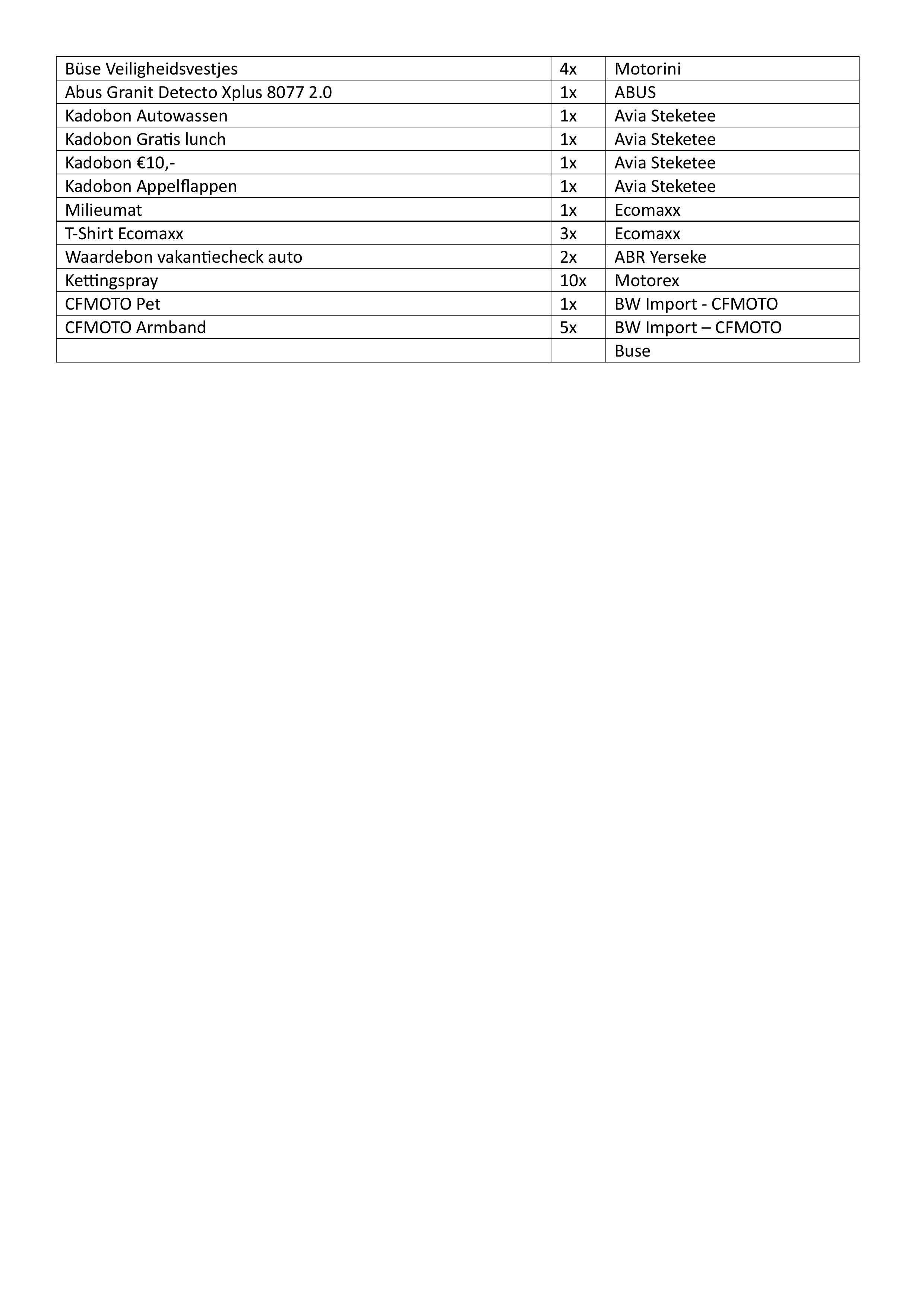 Wij hebben weer een gevarieerde prijzenpot voor u klaarstaan met meer dan 100 mooie prijzen, en geen prijs? Niet getreurd, ook hebben wij weer leuke troostprijzen klaar liggen!